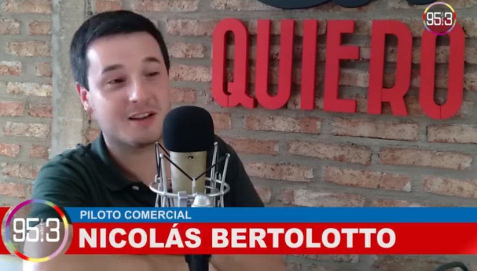Nicolás Bertolotto: "La sensación de volar no se compara con nada"El piloto comercial pasó por Radio QUIERO! 95.3 y contó cómo comenzó en esta carrera que lo llevó a volar desde helicópteros hasta aviones de más de 5 toneladas, por la región, el país, y vuelos inter