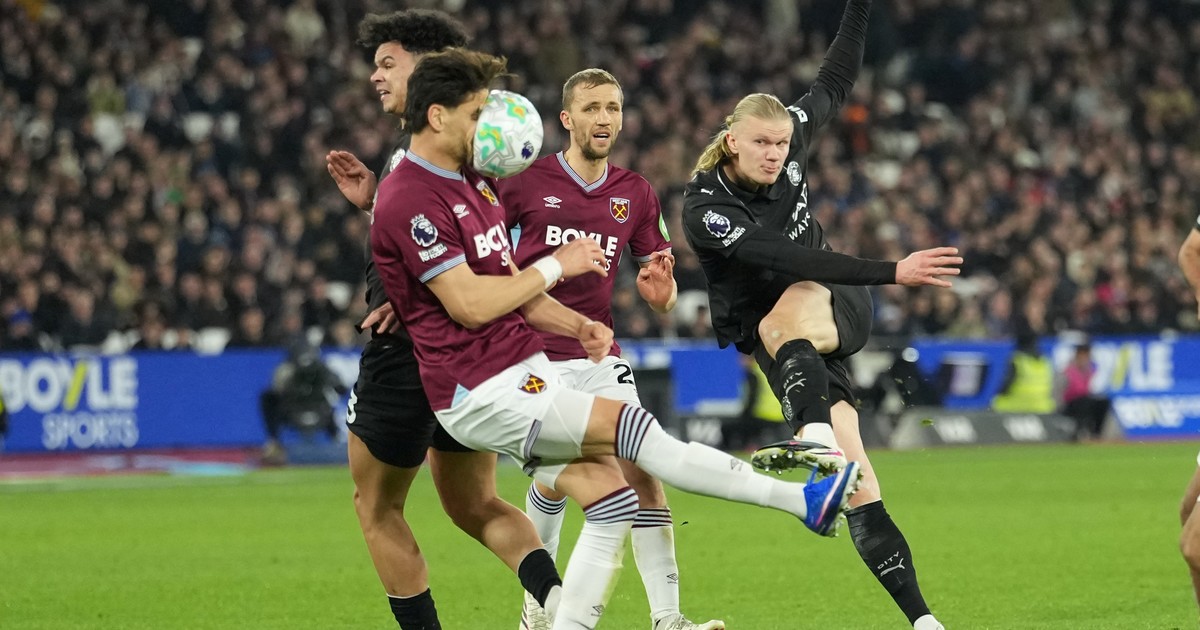 Un zurdazo del noruego del Manchester City contra la cara de Mavropanos, del West Ham, fue captado por una brillante fotograía de AP. Mirá....